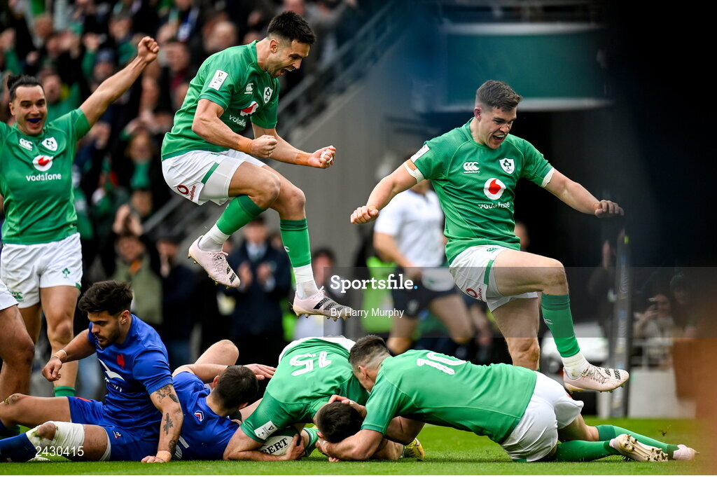 11 February 2023; Hugo Keenan of Ireland, 15, celebrates with teammates including Conor Murray after scoring his side's first try during the Guinness Six Nations Rugby Championship match between Ireland and France at the Aviva Stadium in Dublin. Photo by Harry Murphy/Sportsfile