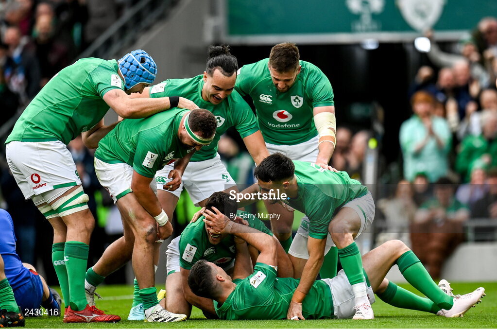 11 February 2023; Hugo Keenan of Ireland, centre celebrates with teammates including Jonathan Sexton and Conor Murray after scoring his side's first try during the Guinness Six Nations Rugby Championship match between Ireland and France at the Aviva Stadium in Dublin. Photo by Harry Murphy/Sportsfile