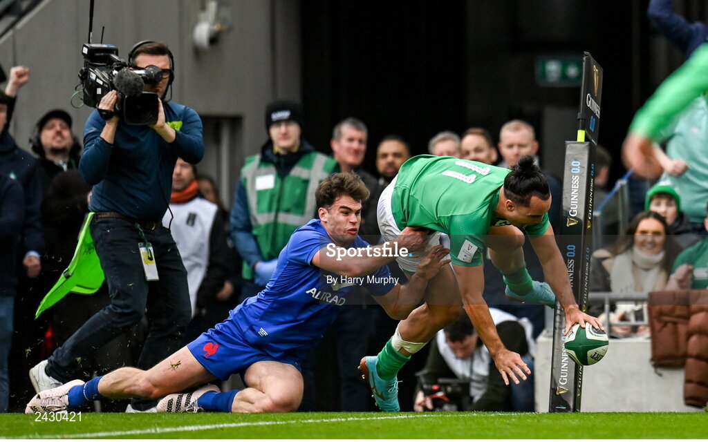 11 February 2023; James Lowe of Ireland scores his side's second try despite the tackle of Damian Penaud of France during the Guinness Six Nations Rugby Championship match between Ireland and France at the Aviva Stadium in Dublin. Photo by Harry Murphy/Sportsfile