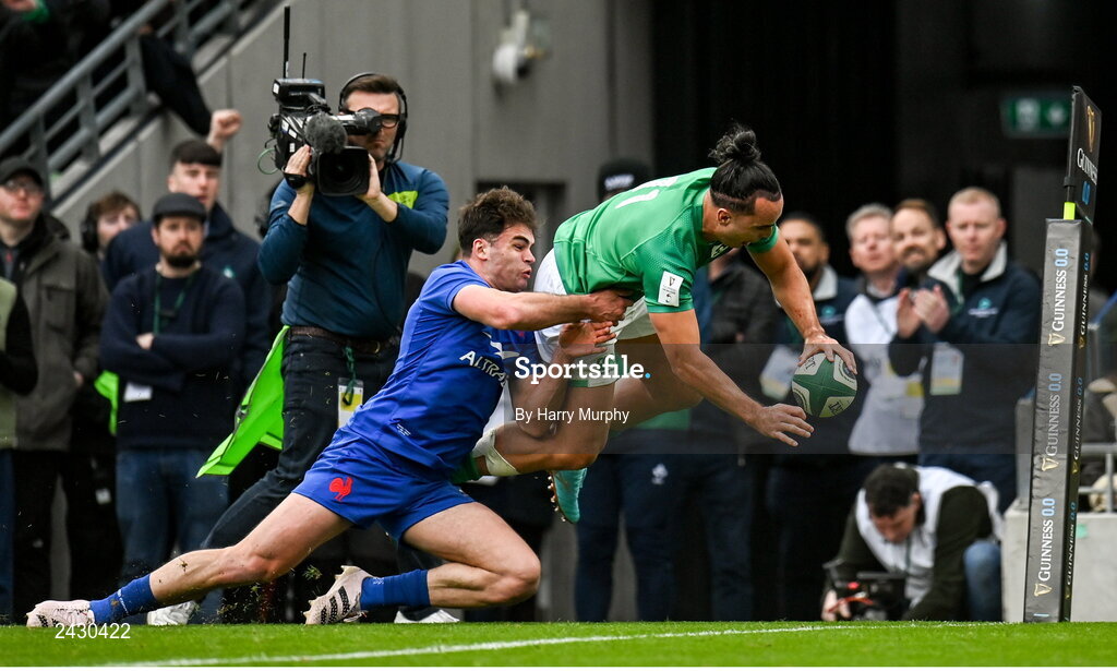 11 February 2023; James Lowe of Ireland scores his side's second try despite the tackle of Damian Penaud of France during the Guinness Six Nations Rugby Championship match between Ireland and France at the Aviva Stadium in Dublin. Photo by Harry Murphy/Sportsfile