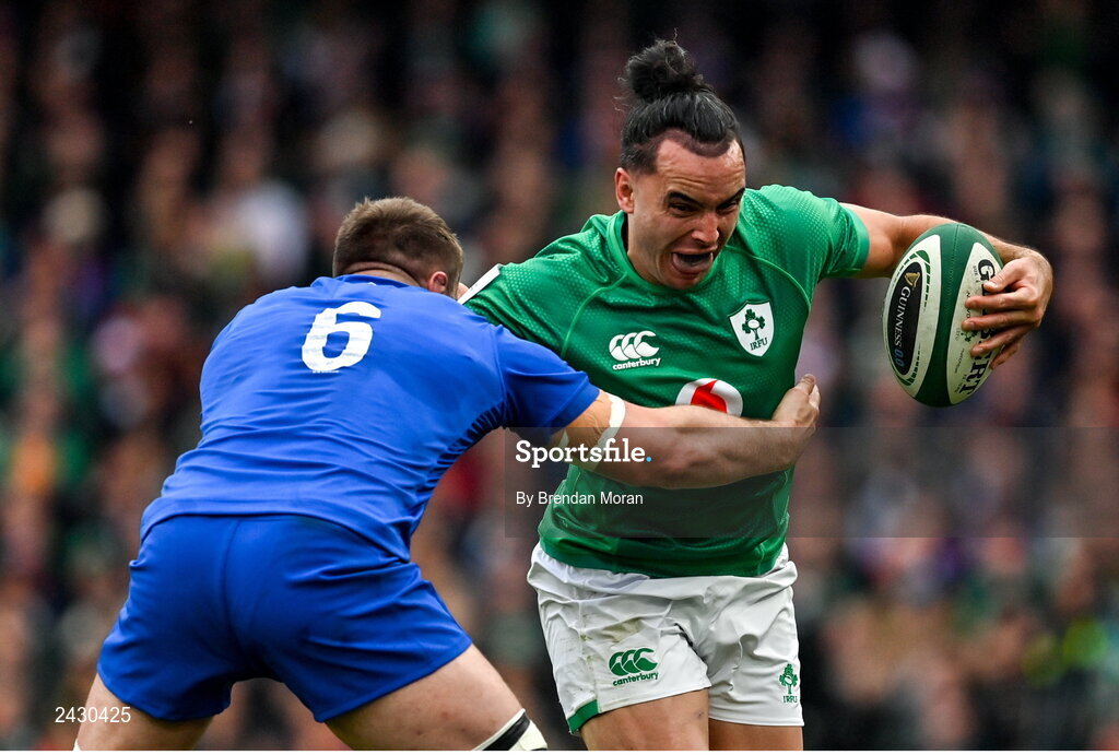11 February 2023; James Lowe of Ireland is tackled by Anthony Jelonch of France during the Guinness Six Nations Rugby Championship match between Ireland and France at the Aviva Stadium in Dublin. Photo by Brendan Moran/Sportsfile