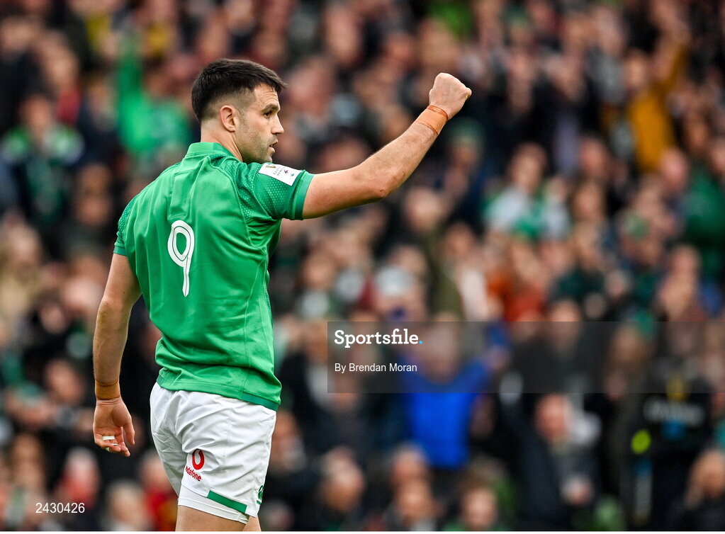11 February 2023; Conor Murray of Ireland celebrates after scoring his side's third try during the Guinness Six Nations Rugby Championship match between Ireland and France at the Aviva Stadium in Dublin. Photo by Brendan Moran/Sportsfile