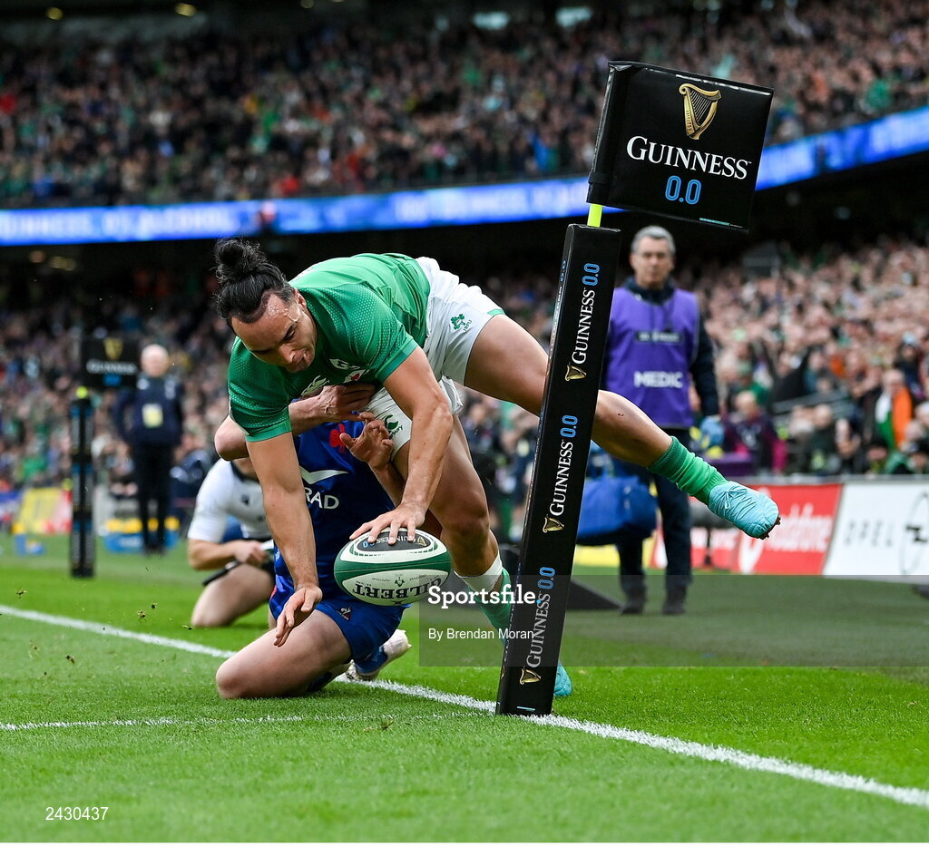11 February 2023; James Lowe of Ireland scores his side's second try despite the tackle of Damian Penaud of France during the Guinness Six Nations Rugby Championship match between Ireland and France at the Aviva Stadium in Dublin. Photo by Brendan Moran/Sportsfile