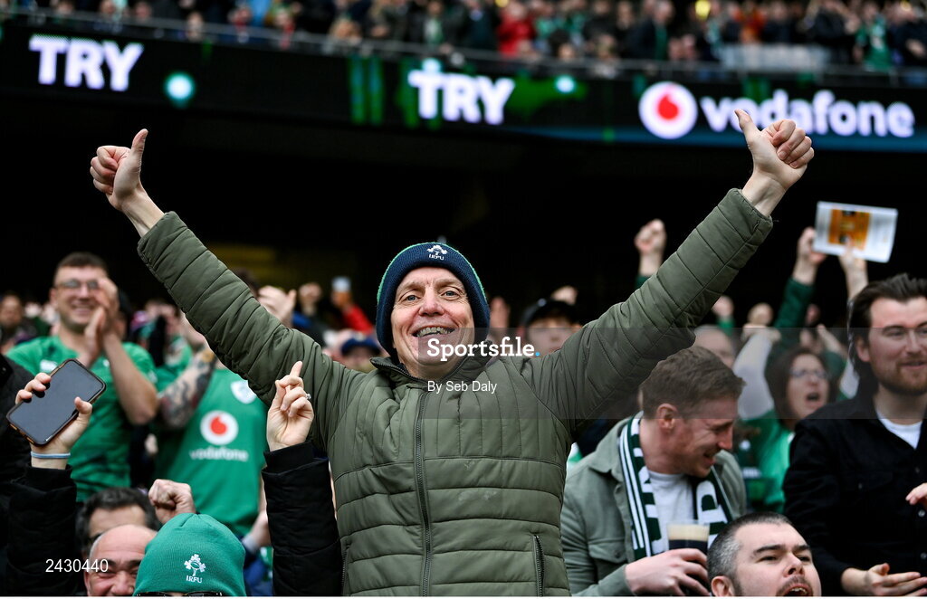 11 February 2023; An Ireland supporter celebrates his side's second try scored by James Lowe during the Guinness Six Nations Rugby Championship match between Ireland and France at the Aviva Stadium in Dublin. Photo by Seb Daly/Sportsfile