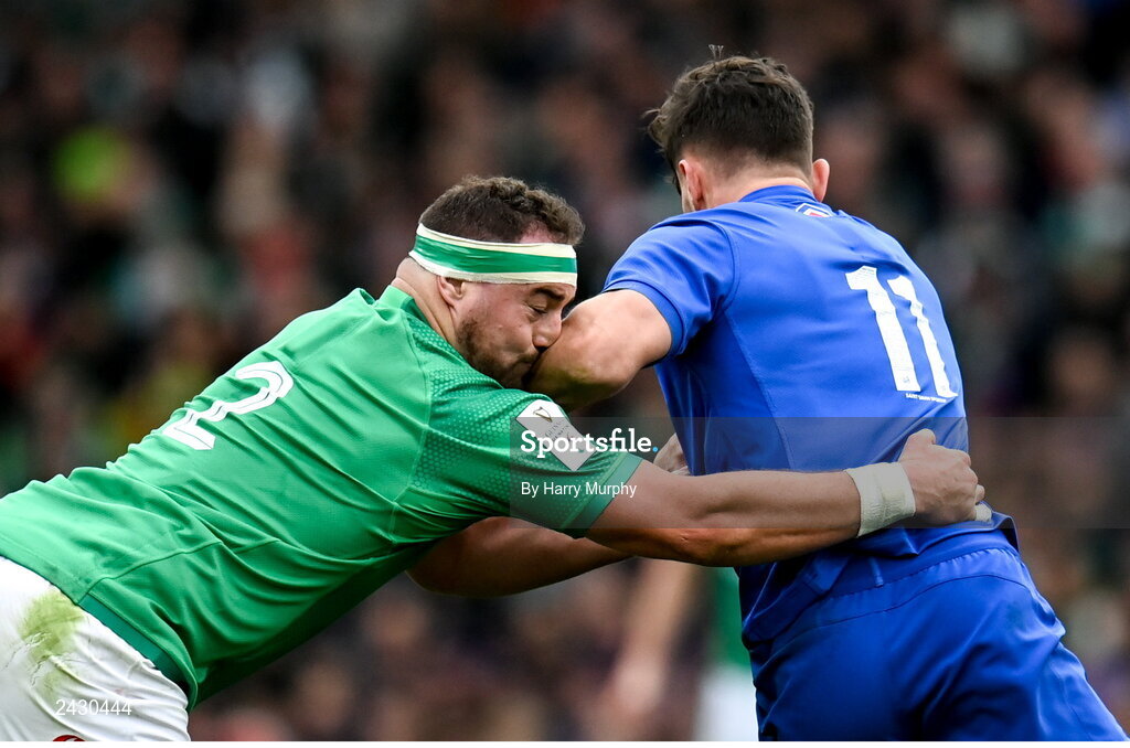 11 February 2023; Ethan Dumortier of France is tackled by Rob Herring of Ireland during the Guinness Six Nations Rugby Championship match between Ireland and France at the Aviva Stadium in Dublin. Photo by Harry Murphy/Sportsfile