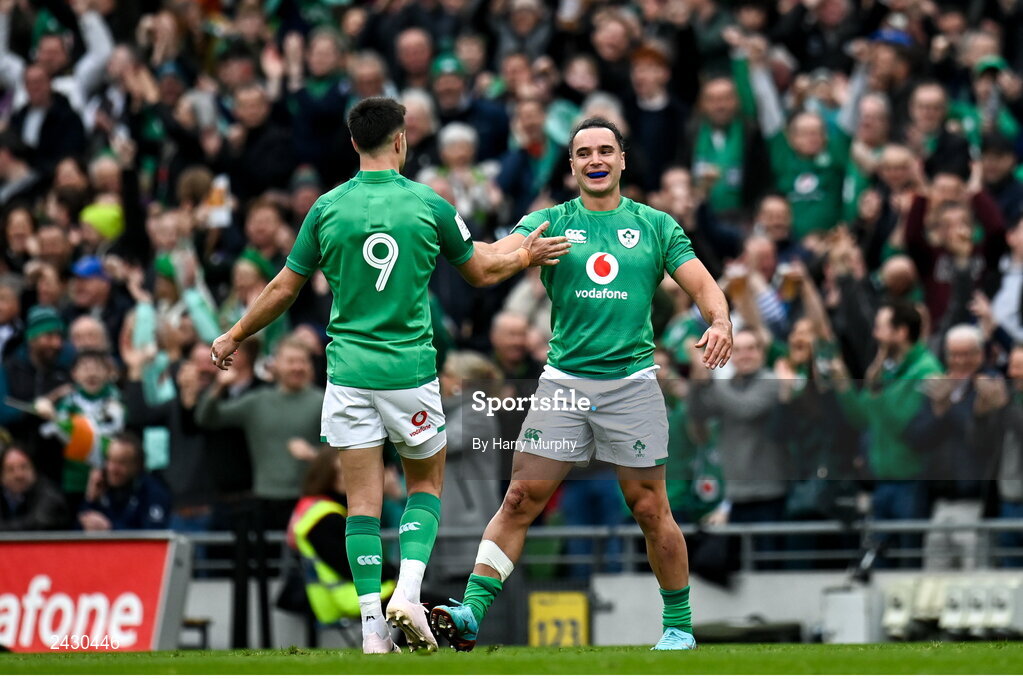 11 February 2023; James Lowe of Ireland celebrates with teammate Conor Murray after scoring his side's second try during the Guinness Six Nations Rugby Championship match between Ireland and France at the Aviva Stadium in Dublin. Photo by Harry Murphy/Sportsfile