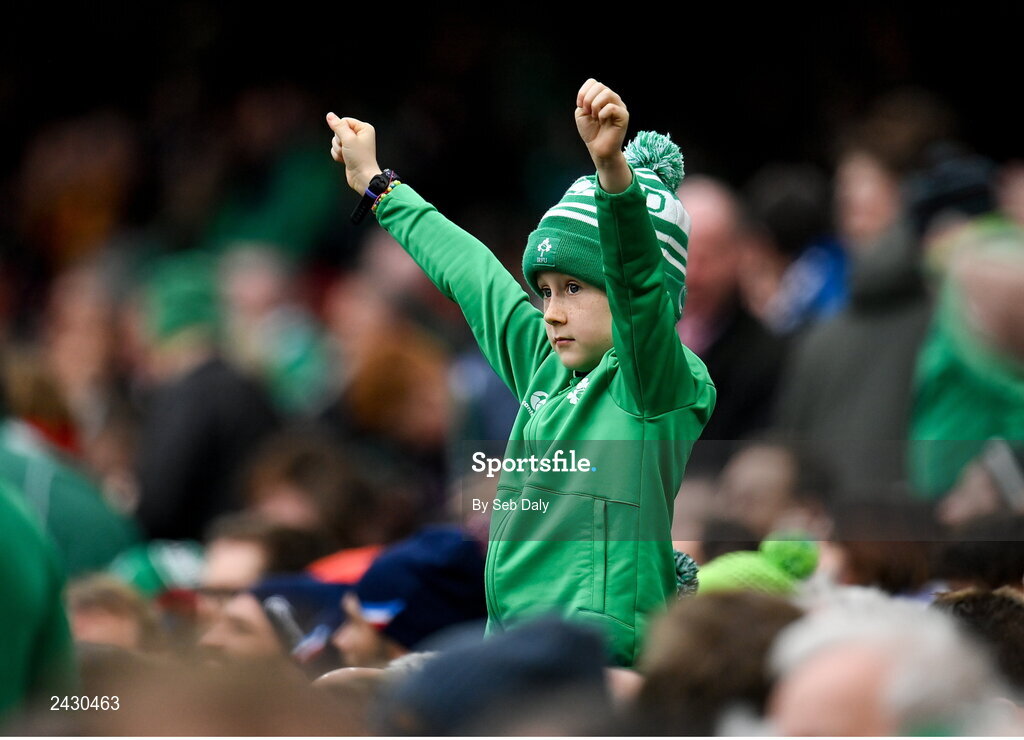 11 February 2023; A young Ireland supporter celebrates his side's third try scored by James Lowe during the Guinness Six Nations Rugby Championship match between Ireland and France at the Aviva Stadium in Dublin. Photo by Seb Daly/Sportsfile