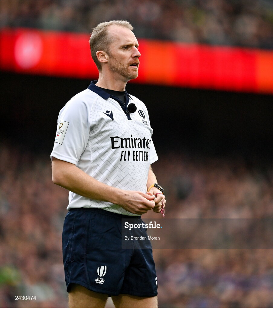 11 February 2023; Referee Wayne Barnes during the Guinness Six Nations Rugby Championship match between Ireland and France at the Aviva Stadium in Dublin. Photo by Brendan Moran/Sportsfile