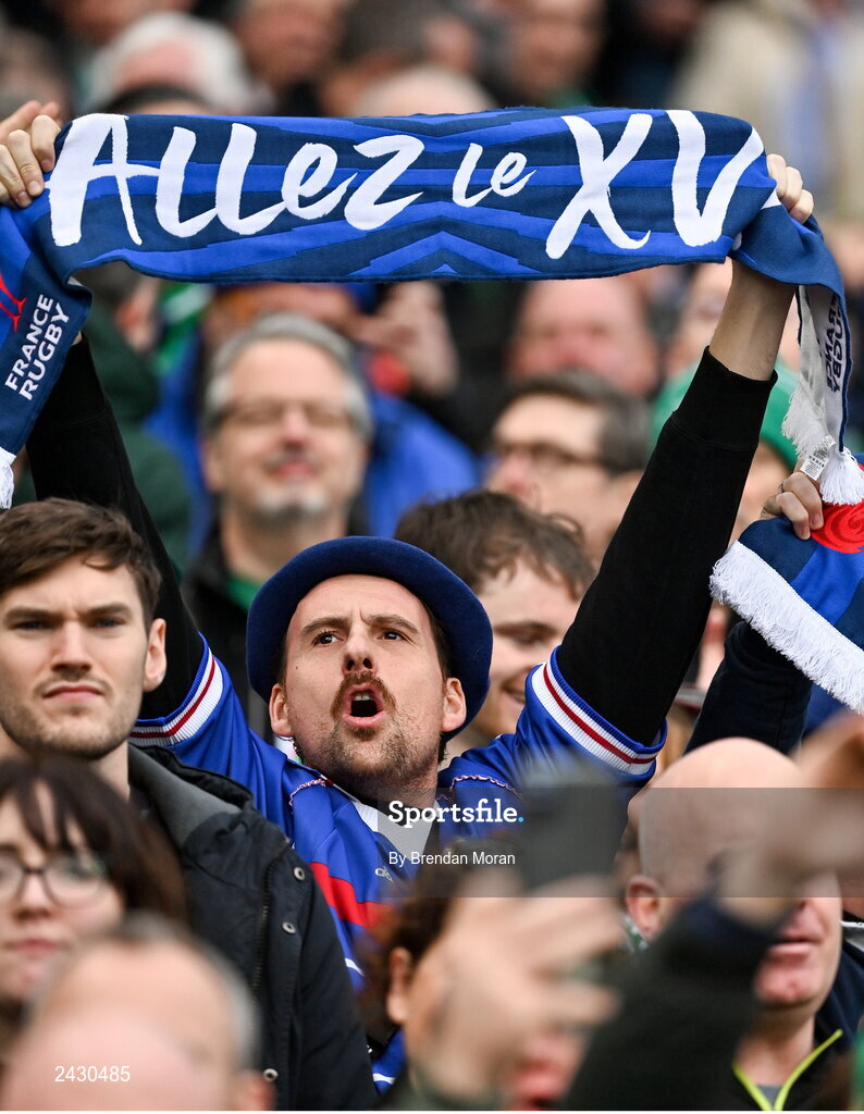 11 February 2023; A France supporter during the national anthems before the Guinness Six Nations Rugby Championship match between Ireland and France at the Aviva Stadium in Dublin. Photo by Brendan Moran/Sportsfile