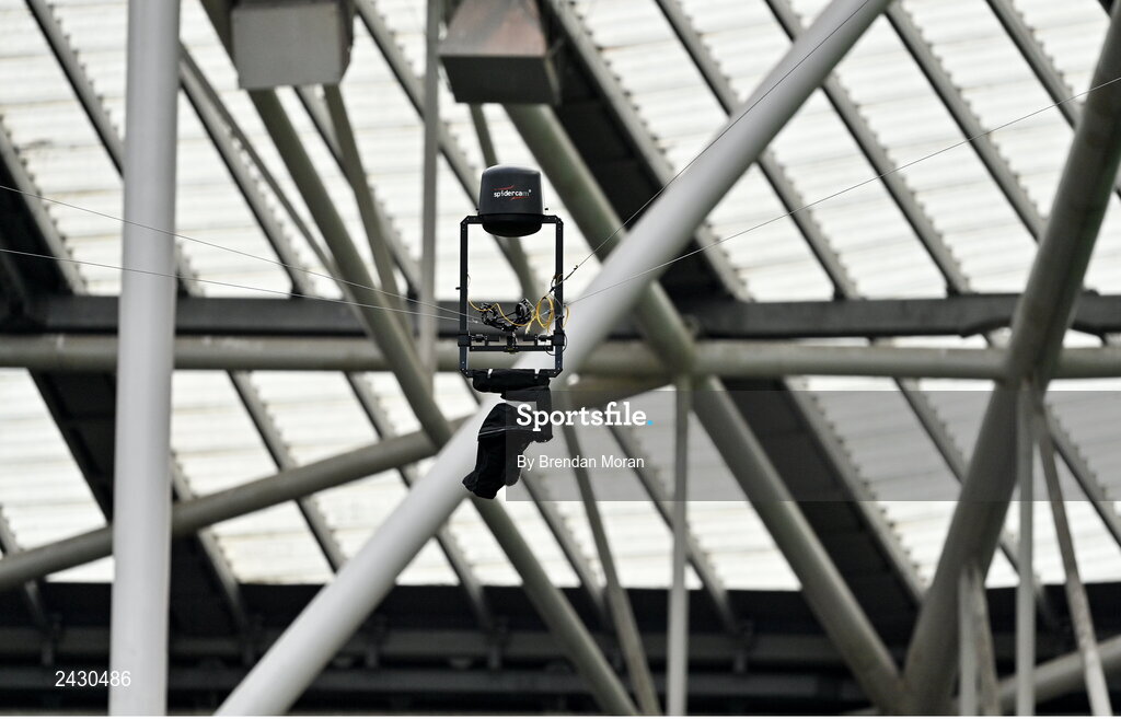 11 February 2023; A TV spidercam in which a ball hit early in the game during the Guinness Six Nations Rugby Championship match between Ireland and France at the Aviva Stadium in Dublin. Photo by Brendan Moran/Sportsfile