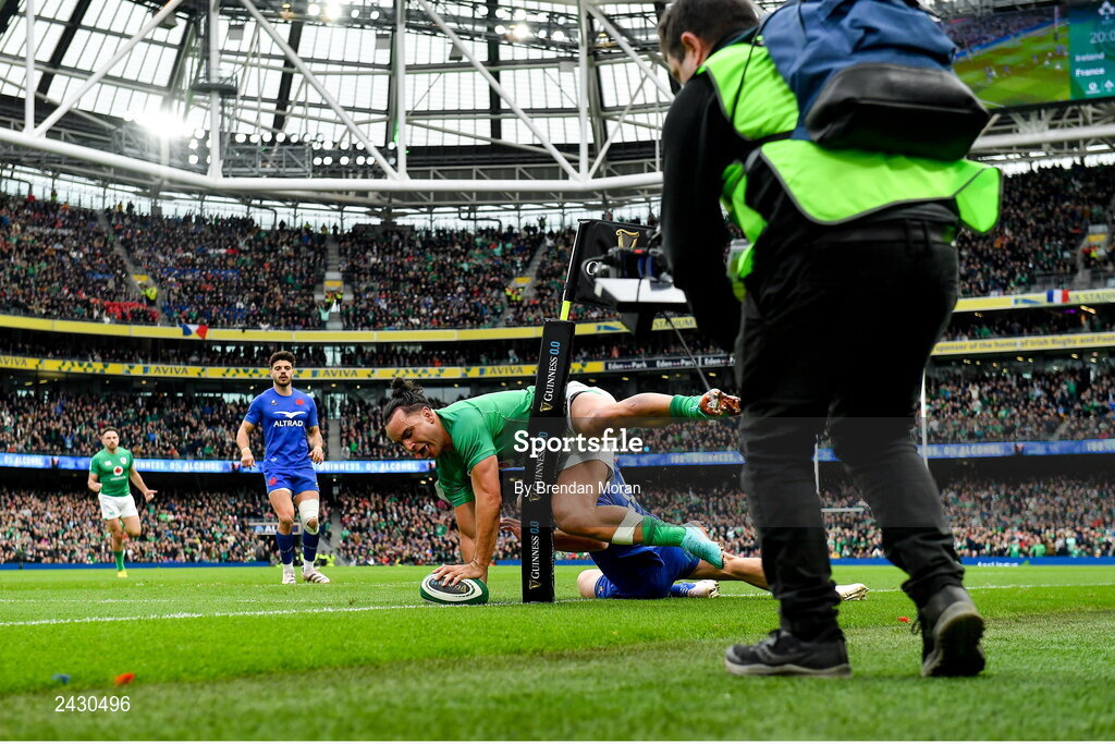 11 February 2023; James Lowe of Ireland scores his side's second try despite the tackle of Damian Penaud of France during the Guinness Six Nations Rugby Championship match between Ireland and France at the Aviva Stadium in Dublin. Photo by Brendan Moran/Sportsfile