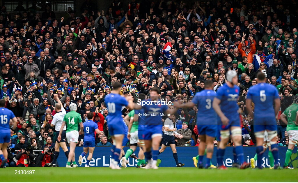 11 February 2023; France supporters celebrate after their side score their first try during the Guinness Six Nations Rugby Championship match between Ireland and France at the Aviva Stadium in Dublin. Photo by Brendan Moran/Sportsfile