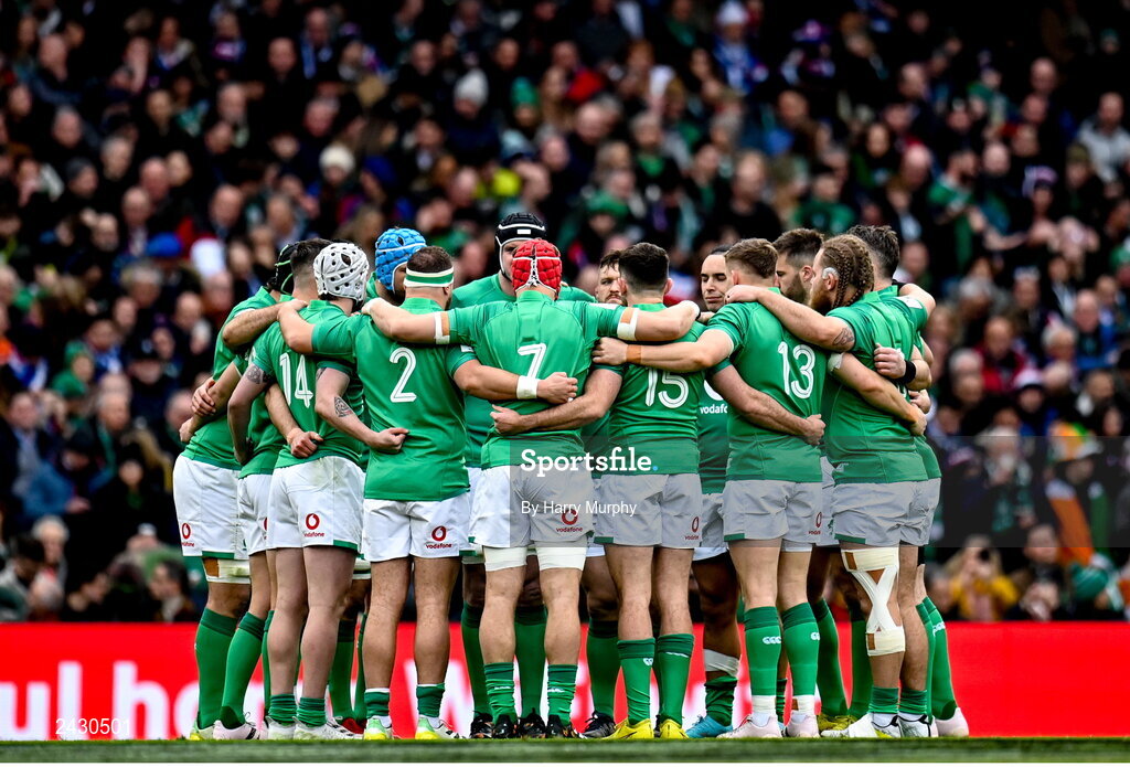 11 February 2023; Ireland players huddle before the Guinness Six Nations Rugby Championship match between Ireland and France at the Aviva Stadium in Dublin. Photo by Harry Murphy/Sportsfile