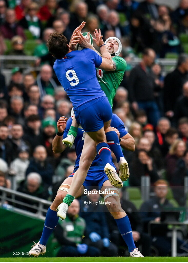 11 February 2023; Mack Hansen of Ireland contests a high ball with Antoine Dupont of France during the Guinness Six Nations Rugby Championship match between Ireland and France at the Aviva Stadium in Dublin. Photo by Harry Murphy/Sportsfile