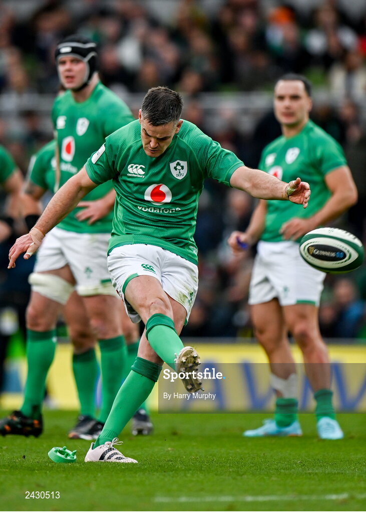 11 February 2023; Jonathan Sexton of Ireland kicks a penalty during the Guinness Six Nations Rugby Championship match between Ireland and France at the Aviva Stadium in Dublin. Photo by Harry Murphy/Sportsfile