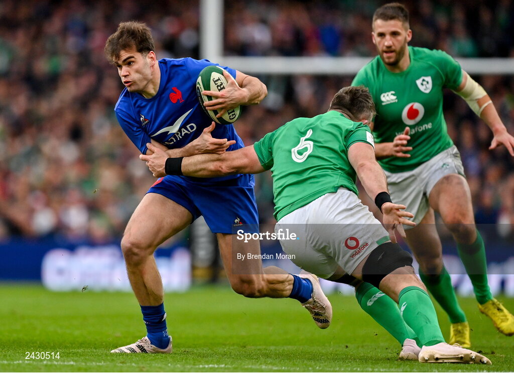 11 February 2023; Damian Penaud of France is tackled by Peter O’Mahony of Ireland during the Guinness Six Nations Rugby Championship match between Ireland and France at the Aviva Stadium in Dublin. Photo by Brendan Moran/Sportsfile