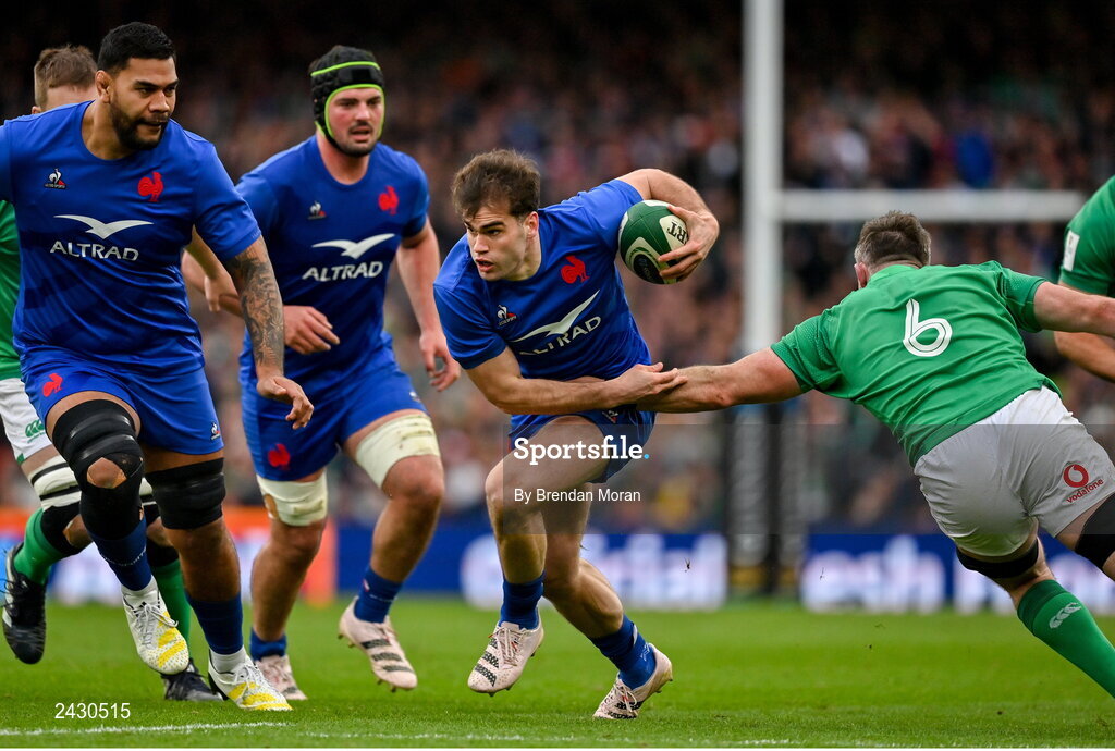 11 February 2023; Damian Penaud of France evades the tackle of Peter O’Mahony of Ireland during the Guinness Six Nations Rugby Championship match between Ireland and France at the Aviva Stadium in Dublin. Photo by Brendan Moran/Sportsfile