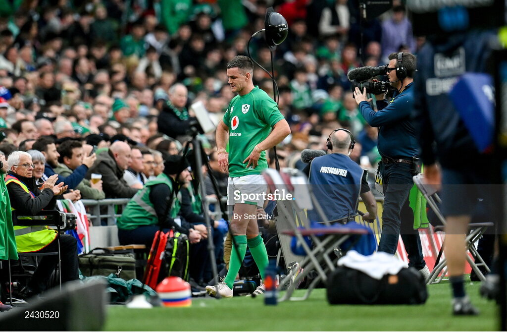 11 February 2023; Jonathan Sexton of Ireland leaves the field after picking up an injury during the Guinness Six Nations Rugby Championship match between Ireland and France at the Aviva Stadium in Dublin. Photo by Seb Daly/Sportsfile
