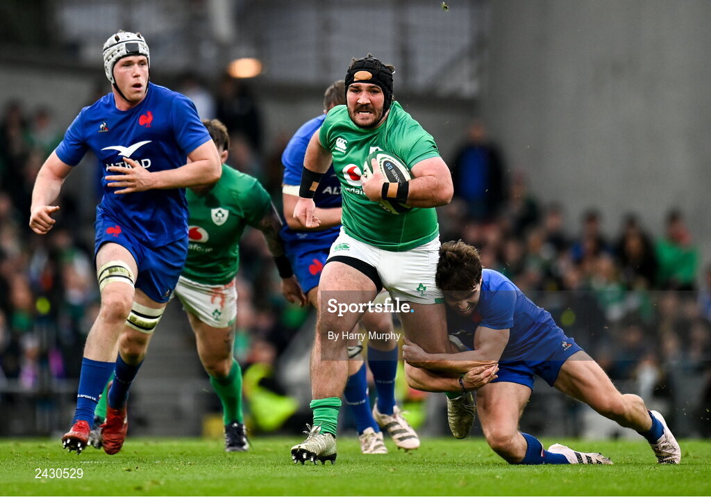 11 February 2023; Tom O’Toole of Ireland is tackled by Antoine Dupont of France during the Guinness Six Nations Rugby Championship match between Ireland and France at the Aviva Stadium in Dublin. Photo by Harry Murphy/Sportsfile