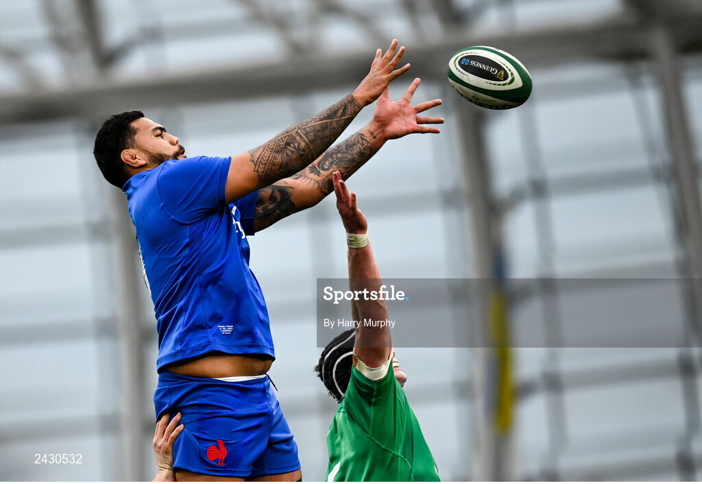 11 February 2023; Romain Taofifenua of France takes possession in a line-out during the Guinness Six Nations Rugby Championship match between Ireland and France at the Aviva Stadium in Dublin. Photo by Harry Murphy/Sportsfile