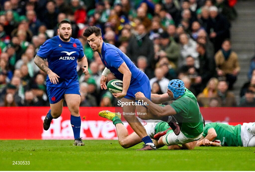 11 February 2023; Ethan Dumortier of France evades the tackle of Tadhg Beirne of Ireland during the Guinness Six Nations Rugby Championship match between Ireland and France at the Aviva Stadium in Dublin. Photo by Brendan Moran/Sportsfile