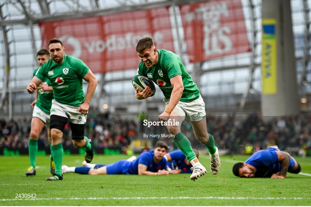 11 February 2023; Garry Ringrose of Ireland celebrates on his way to scoring his side's fourth try, in the 72nd minute, during the Guinness Six Nations Rugby Championship match between Ireland and France at the Aviva Stadium in Dublin. Photo by Harry Murphy/Sportsfile