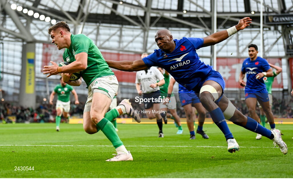 11 February 2023; Garry Ringrose of Ireland on his way to scoring his side's fourth try, in the 72nd minute, despite the tackle of Sekou Macalou of France during the Guinness Six Nations Rugby Championship match between Ireland and France at the Aviva Stadium in Dublin. Photo by Harry Murphy/Sportsfile