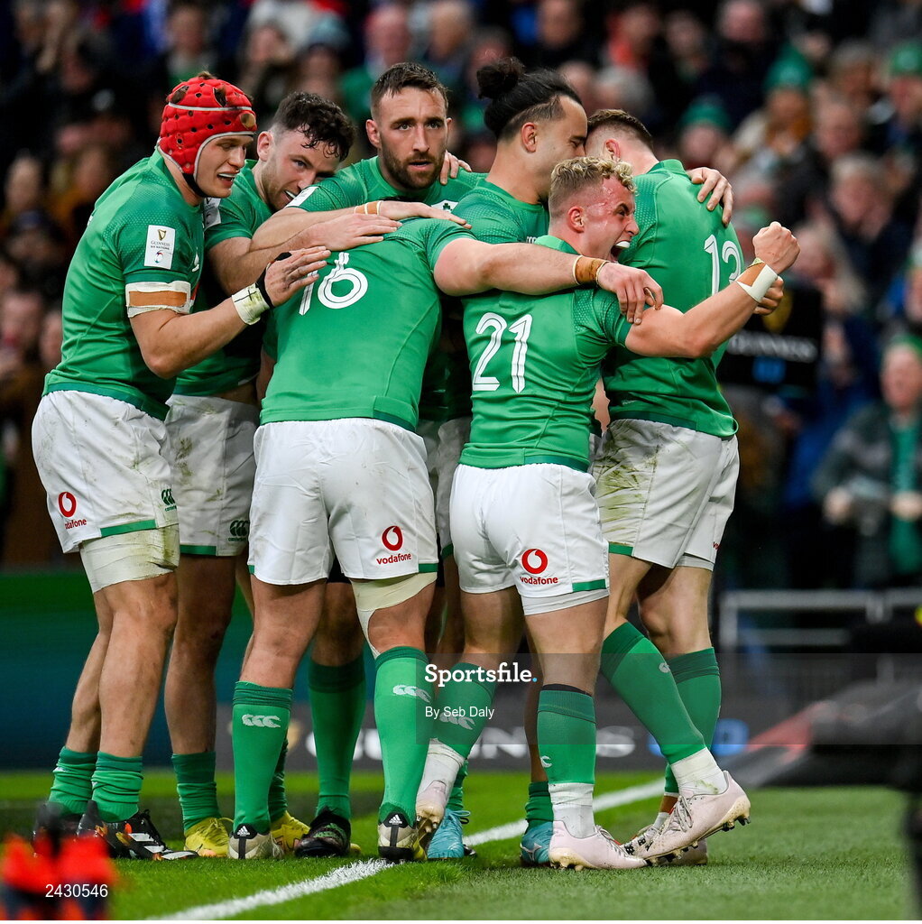 11 February 2023; Craig Casey of Ireland, second from right, celebrates after his side score their fourth try scored by teammate Garry Ringrose during the Guinness Six Nations Rugby Championship match between Ireland and France at the Aviva Stadium in Dublin. Photo by Seb Daly/Sportsfile