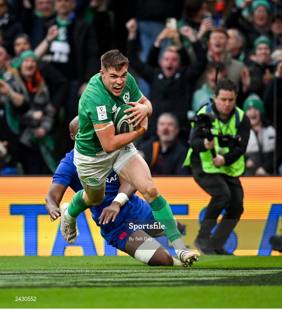 11 February 2023; Garry Ringrose of Ireland on his way to scoring his side's fourth try, in the 72nd minute, despite the tackle of Sekou Macalou of France during the Guinness Six Nations Rugby Championship match between Ireland and France at the Aviva Stadium in Dublin. Photo by Seb Daly/Sportsfile