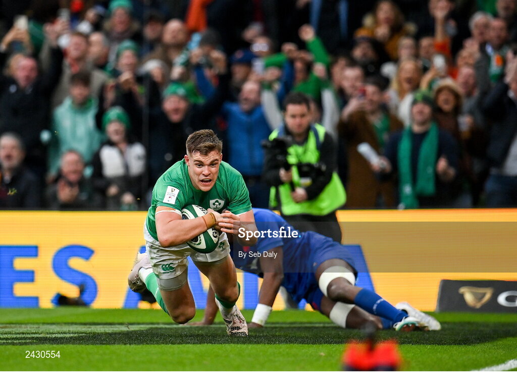 11 February 2023; Garry Ringrose of Ireland on his way to scoring his side's fourth try, in the 72nd minute, despite the tackle of Sekou Macalou of France during the Guinness Six Nations Rugby Championship match between Ireland and France at the Aviva Stadium in Dublin. Photo by Seb Daly/Sportsfile
