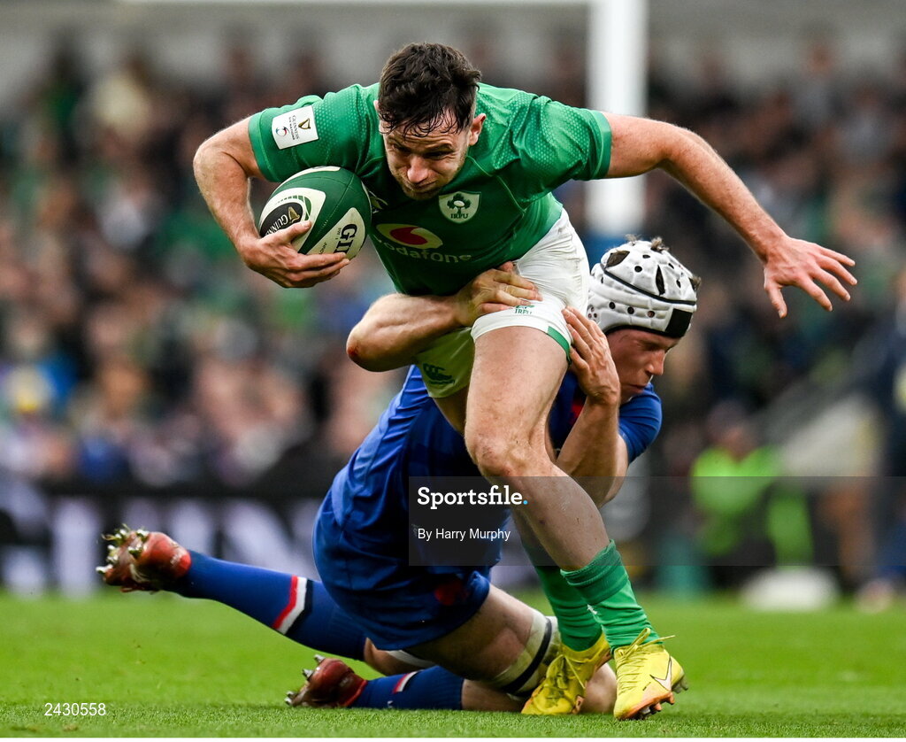 11 February 2023; Hugo Keenan of Ireland is tackled by Thibaud Flament of France during the Guinness Six Nations Rugby Championship match between Ireland and France at the Aviva Stadium in Dublin. Photo by Harry Murphy/Sportsfile