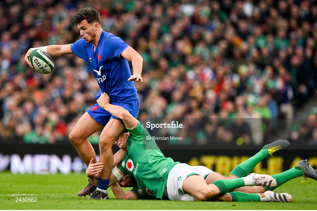 11 February 2023; Ethan Dumortier of France, is tackled by Stuart McCloskey, and Rónan Kelleher of Ireland during the Guinness Six Nations Rugby Championship match between Ireland and France at the Aviva Stadium in Dublin. Photo by Brendan Moran/Sportsfile