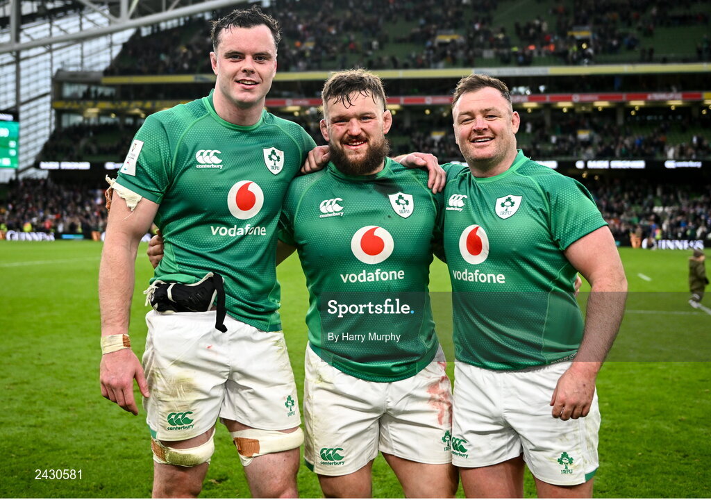 11 February 2023; Ireland players from left, James Ryan, Andrew Porter, and Dave Kilcoyne, after making their 50th appearances for Ireland after the Guinness Six Nations Rugby Championship match between Ireland and France at the Aviva Stadium in Dublin. Photo by Harry Murphy/Sportsfile