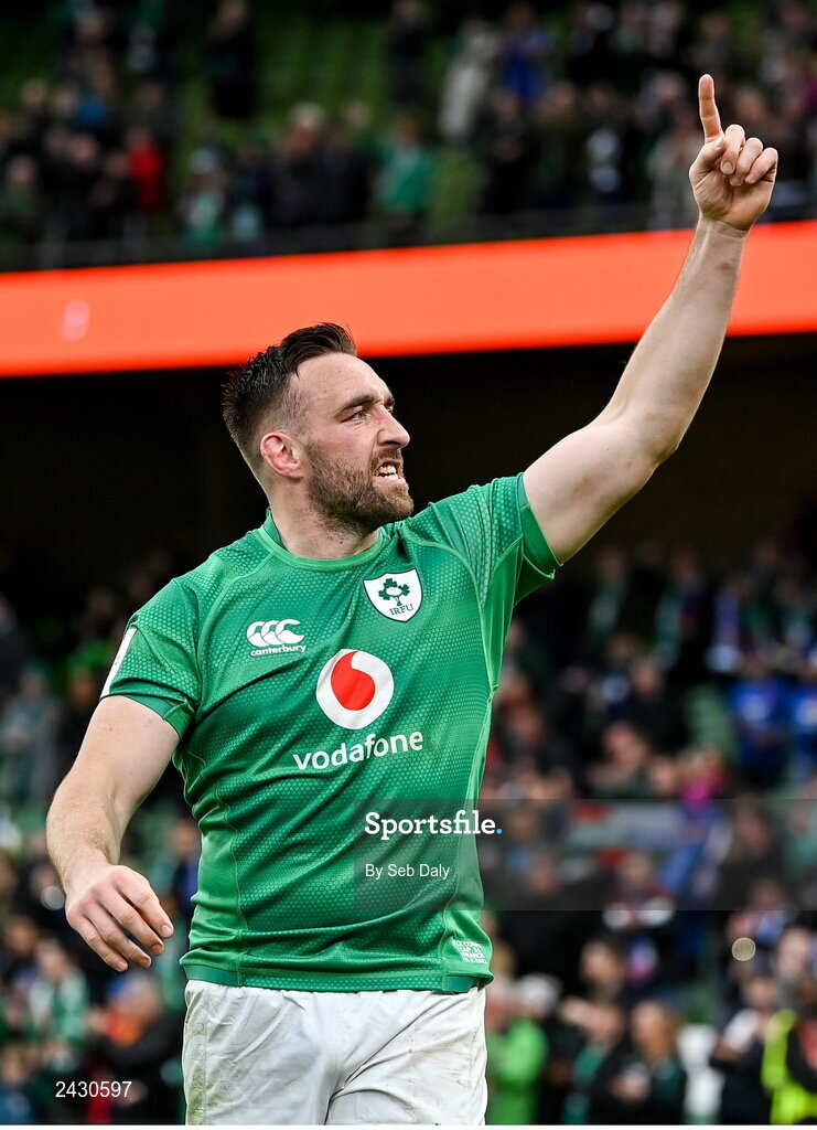 11 February 2023; Jack Conan of Ireland celebrates after his side's victory in the Guinness Six Nations Rugby Championship match between Ireland and France at the Aviva Stadium in Dublin. Photo by Seb Daly/Sportsfile