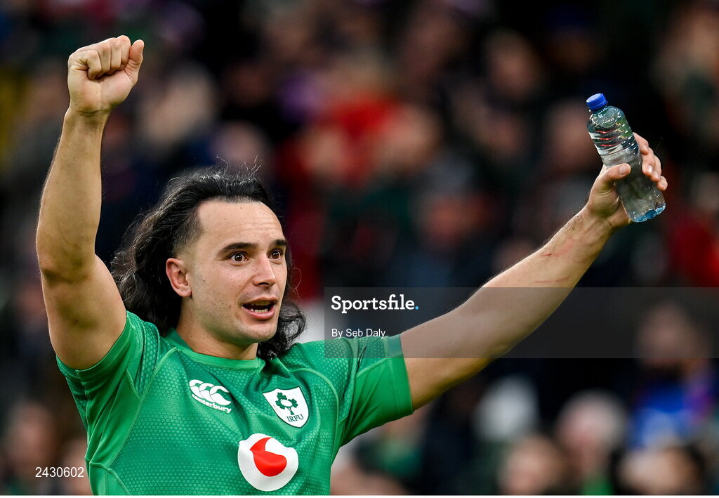 11 February 2023; James Lowe of Ireland celebrates after his side's victory in the Guinness Six Nations Rugby Championship match between Ireland and France at the Aviva Stadium in Dublin. Photo by Seb Daly/Sportsfile