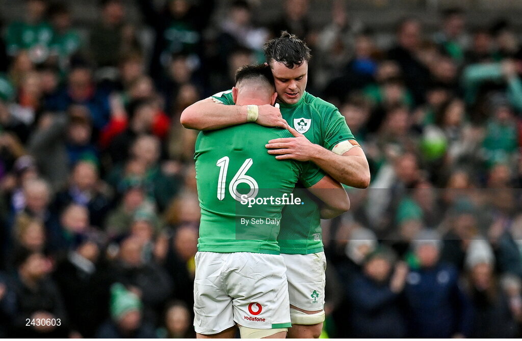 11 February 2023; James Ryan, right, and Rónan Kelleher of Ireland celebrate at the final whistle after their side's victory in the Guinness Six Nations Rugby Championship match between Ireland and France at the Aviva Stadium in Dublin. Photo by Seb Daly/Sportsfile