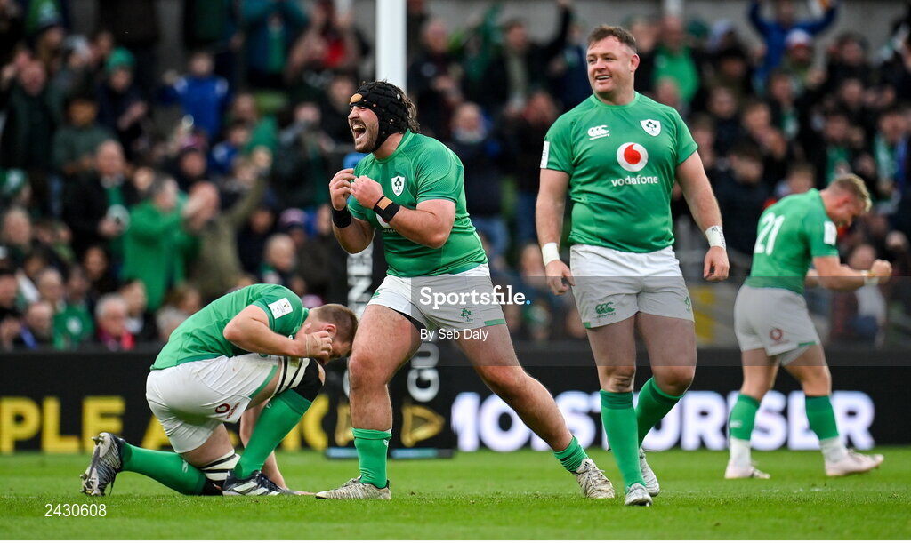 11 February 2023; Ireland players, from left, Iain Henderson, Tom O’Toole, Dave Kilcoyne and Craig Casey celebrate at the final whistle after their side's victory in the Guinness Six Nations Rugby Championship match between Ireland and France at the Aviva Stadium in Dublin. Photo by Seb Daly/Sportsfile