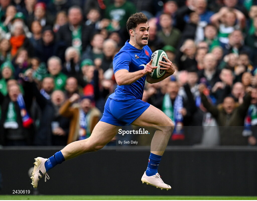 11 February 2023; Damian Penaud of France celebrates on his way to scoring his side's first try during the Guinness Six Nations Rugby Championship match between Ireland and France at the Aviva Stadium in Dublin. Photo by Seb Daly/Sportsfile