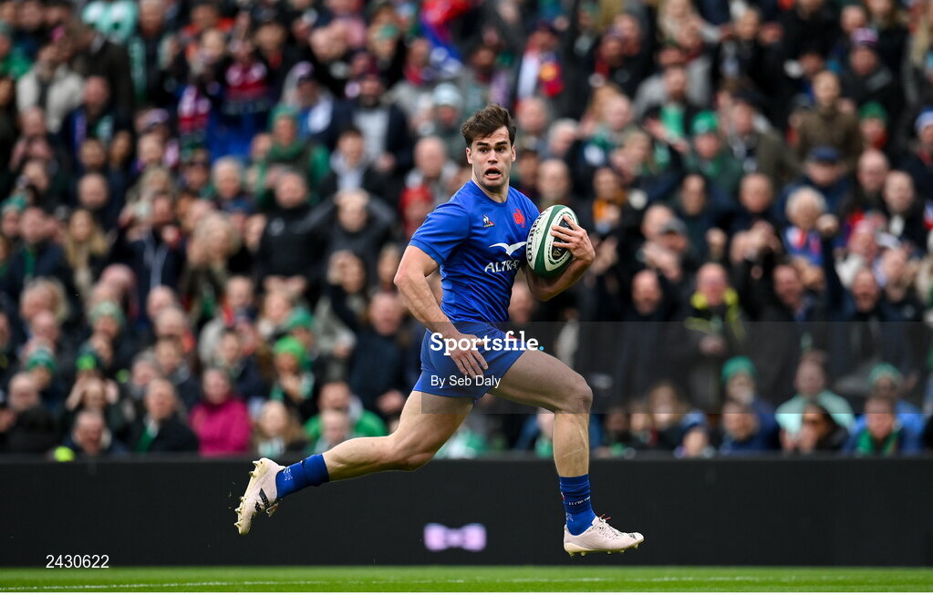 11 February 2023; Damian Penaud of France on his way to scoring his side's first try during the Guinness Six Nations Rugby Championship match between Ireland and France at the Aviva Stadium in Dublin. Photo by Seb Daly/Sportsfile