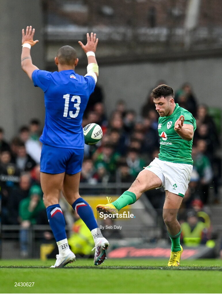 11 February 2023; Hugo Keenan of Ireland kicks a 50:22 during the Guinness Six Nations Rugby Championship match between Ireland and France at the Aviva Stadium in Dublin. Photo by Seb Daly/Sportsfile
