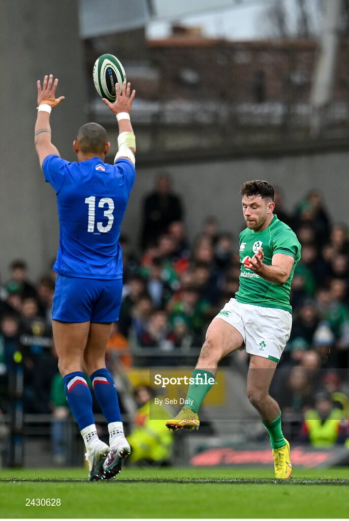 11 February 2023; Hugo Keenan of Ireland kicks a 50:22 during the Guinness Six Nations Rugby Championship match between Ireland and France at the Aviva Stadium in Dublin. Photo by Seb Daly/Sportsfile