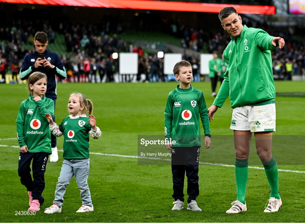 11 February 2023; Jonathan Sexton of Ireland with his children Luca, Amy and Sophie after his side's victory in the Guinness Six Nations Rugby Championship match between Ireland and France at the Aviva Stadium in Dublin. Photo by Harry Murphy/Sportsfile
