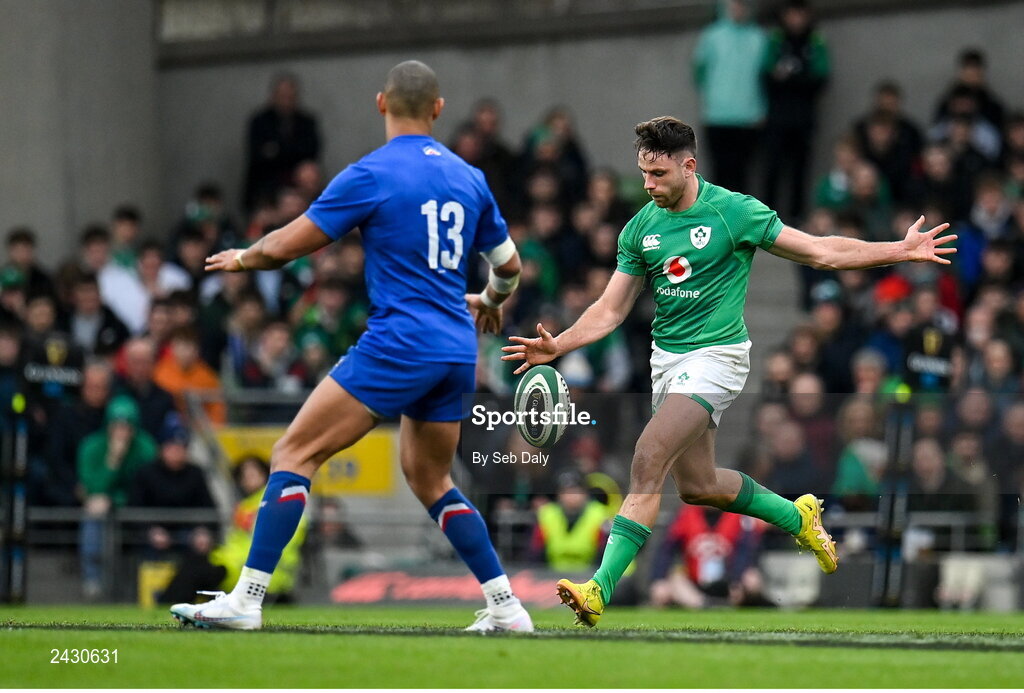 11 February 2023; Hugo Keenan of Ireland kicks a 50:22 during the Guinness Six Nations Rugby Championship match between Ireland and France at the Aviva Stadium in Dublin. Photo by Seb Daly/Sportsfile
