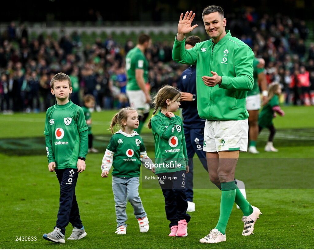 11 February 2023; Jonathan Sexton of Ireland with his children Luca, Amy and Sophie after his side's victory in the Guinness Six Nations Rugby Championship match between Ireland and France at the Aviva Stadium in Dublin. Photo by Harry Murphy/Sportsfile