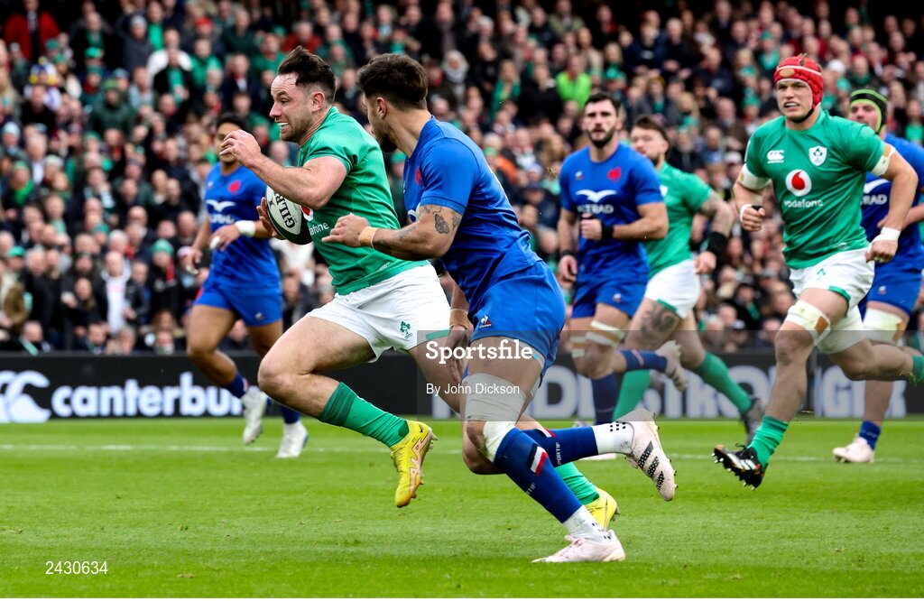 11 February 2023; Hugo Keenan of Ireland on his way to scoring his side's first try, in the 9th minute, during the Guinness Six Nations Rugby Championship match between Ireland and France at the Aviva Stadium in Dublin. Photo by John Dickson/Sportsfile