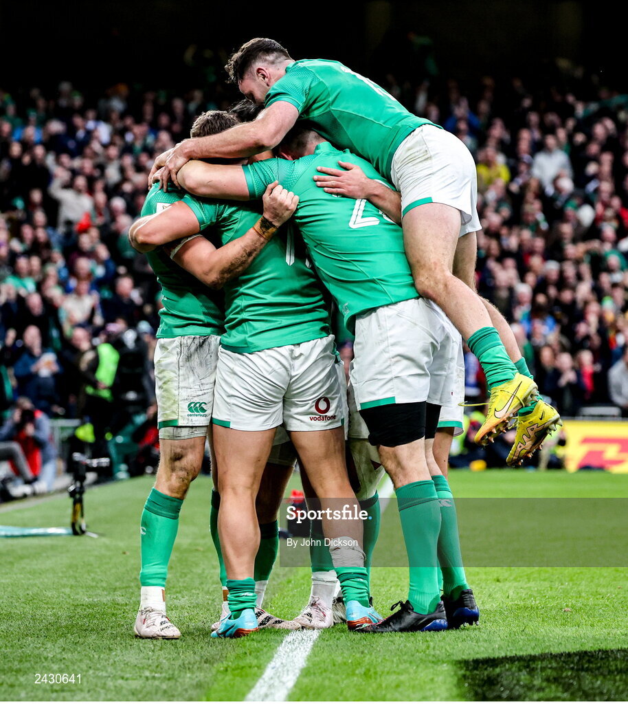 11 February 2023; Ireland players celebrate scoring their side's fourth try, in the 72nd minute, during the Guinness Six Nations Rugby Championship match between Ireland and France at the Aviva Stadium in Dublin. Photo by John Dickson/Sportsfile