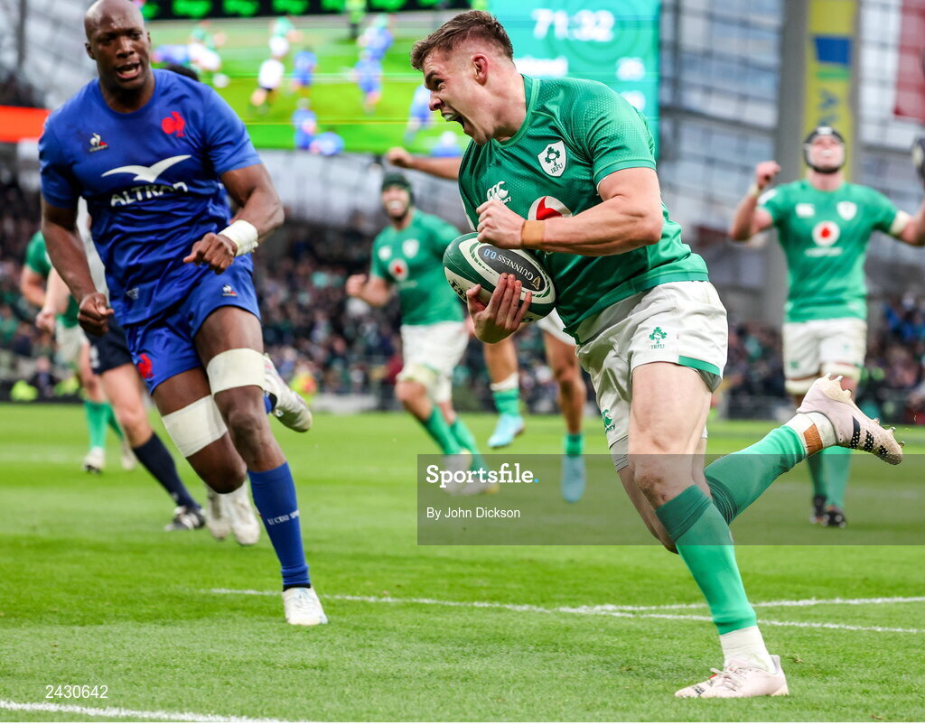 11 February 2023; Garry Ringrose of Ireland on his way to scoring his side's fourth try, in the 72nd minute, despite the tackle of Sekou Macalou of France during the Guinness Six Nations Rugby Championship match between Ireland and France at the Aviva Stadium in Dublin. Photo by John Dickson/Sportsfile