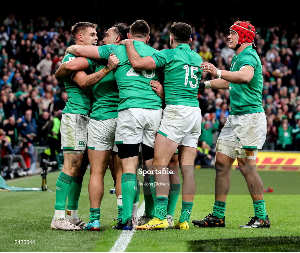 11 February 2023; Ireland players celebrate scoring their side's fourth try, in the 72nd minute, during the Guinness Six Nations Rugby Championship match between Ireland and France at the Aviva Stadium in Dublin. Photo by John Dickson/Sportsfile