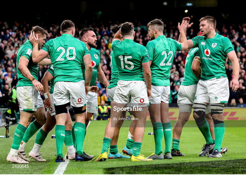 11 February 2023; Ireland players celebrate scoring their side's fourth try, in the 72nd minute, during the Guinness Six Nations Rugby Championship match between Ireland and France at the Aviva Stadium in Dublin. Photo by John Dickson/Sportsfile