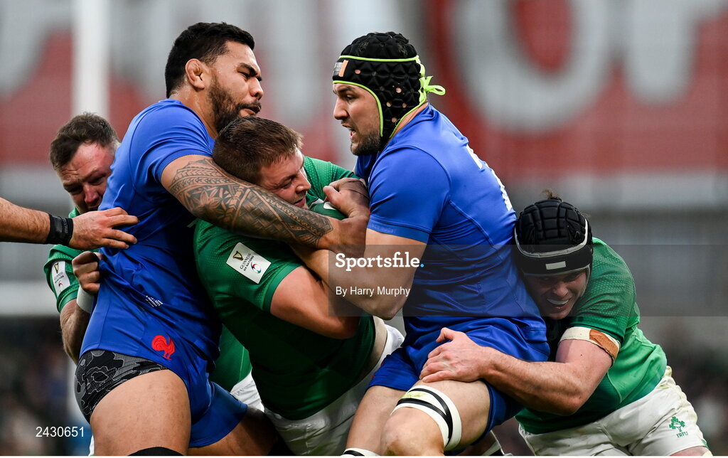 11 February 2023; Iain Henderson of Ireland is tackled by Romain Taofifenua, left, and Francois Cros of France during the Guinness Six Nations Rugby Championship match between Ireland and France at the Aviva Stadium in Dublin. Photo by Harry Murphy/Sportsfile